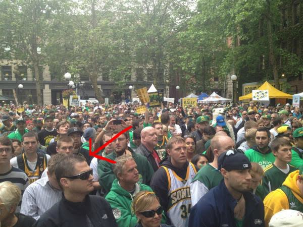 Sure, we're all happy that thousands of Sonics fans showed up for the rally yesterday. But what the hell was that CYBORG doing there? Was he an evil agent of the NBA? I smell a STERN-spiracy! I think it might be time to call in Danny Fortson to investigate.